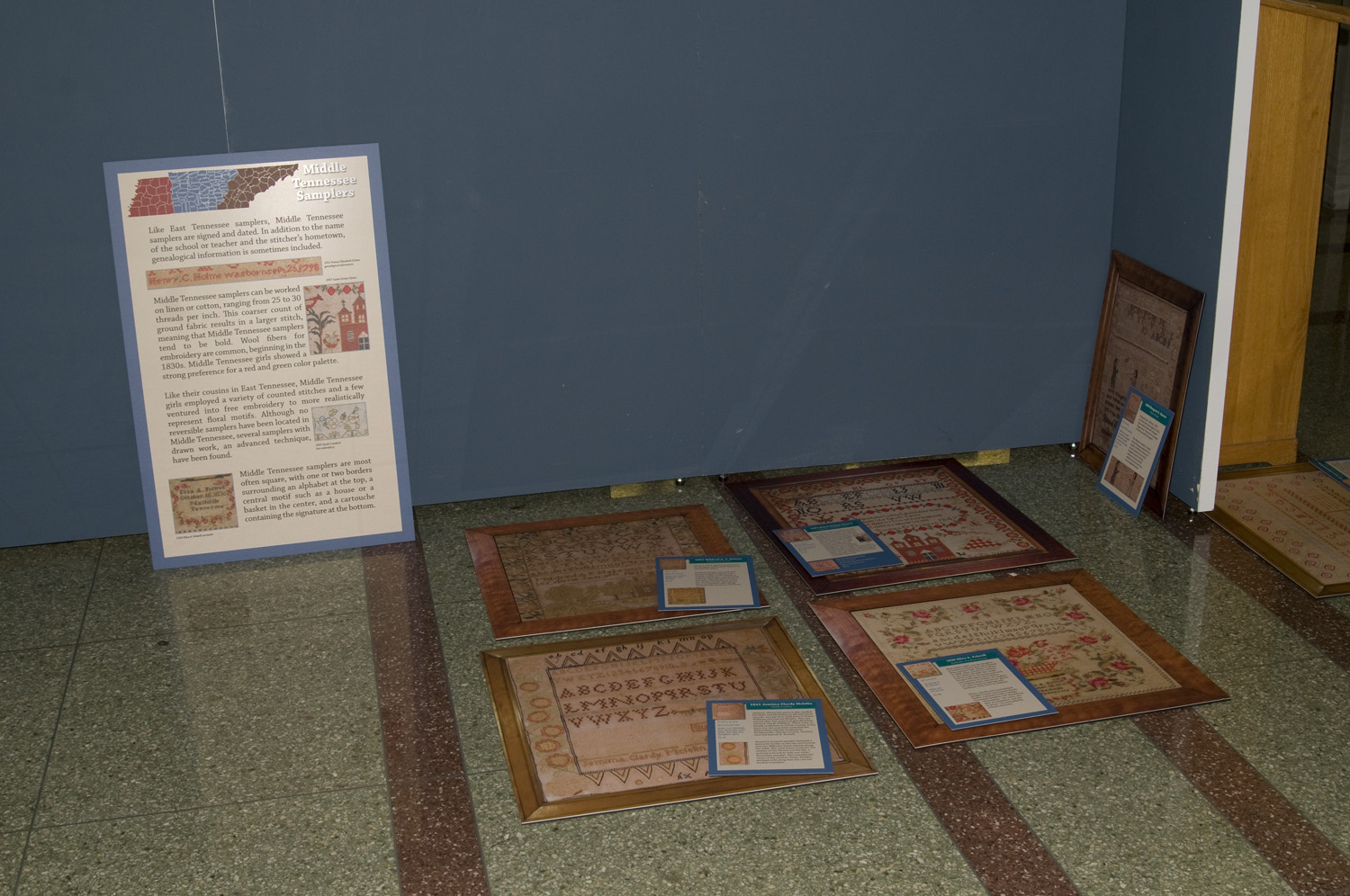 Since 2004, the Tennessee Sampler Survey has been documenting 19th century embroidery. Twenty Tennessee samplers were selected for the exhibit, each from a different county. The exhibit presents the samplers on full-sized panels; the actual samplers are not part of this exhibit due to their fragility. Five text panels, explaining the work of the Tennessee Sampler Survey and the regional characteristics of the samplers, are also part of the exhibit.